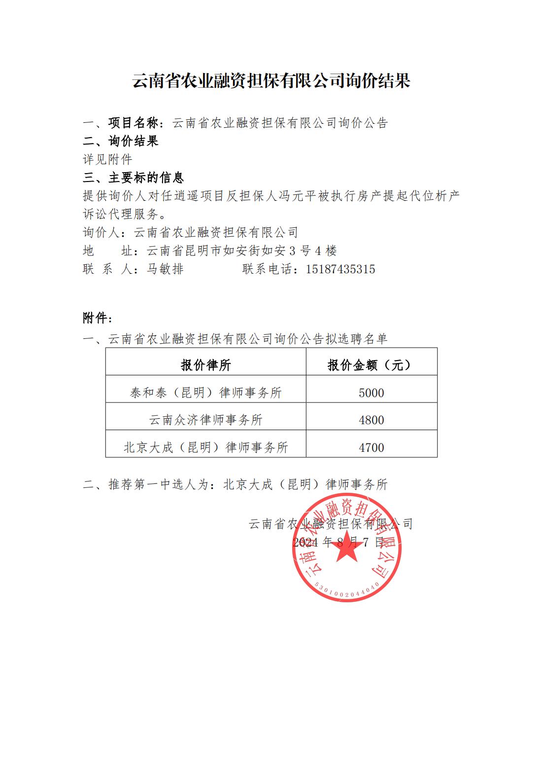 云南省農(nóng)業(yè)融資擔(dān)保有限公司詢價(jià)結(jié)果
