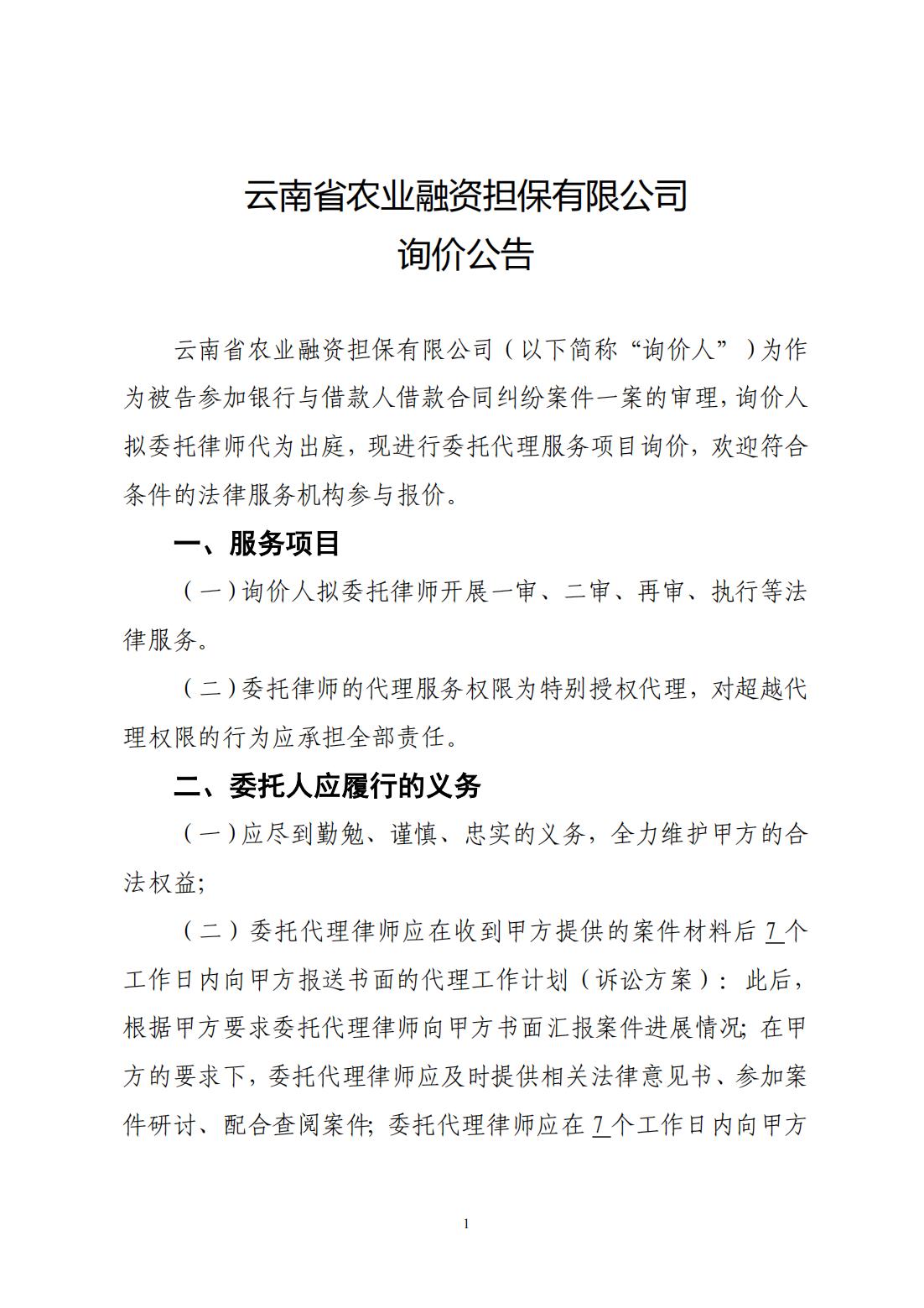云南省農(nóng)業(yè)融資擔保有限公司詢價公告