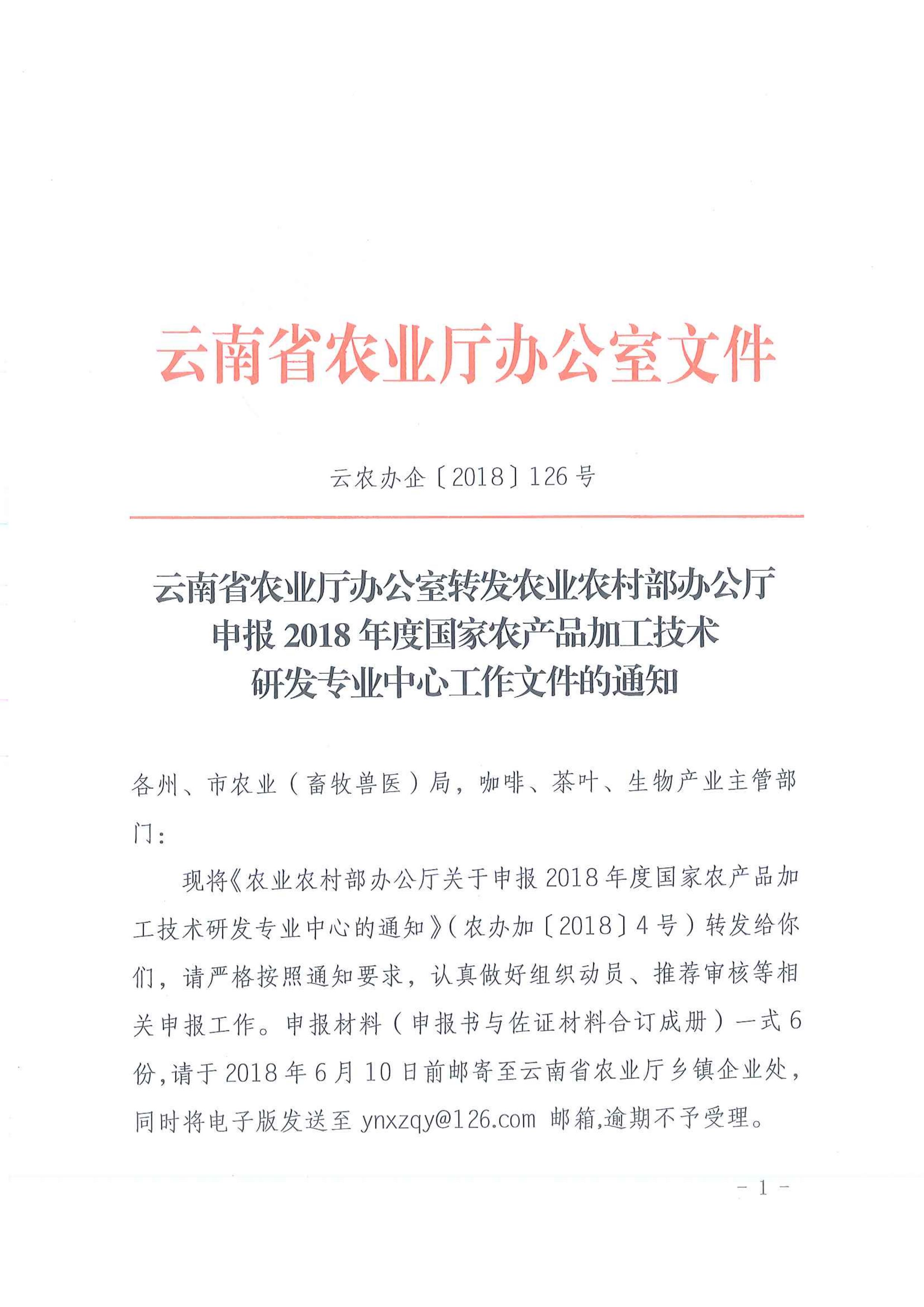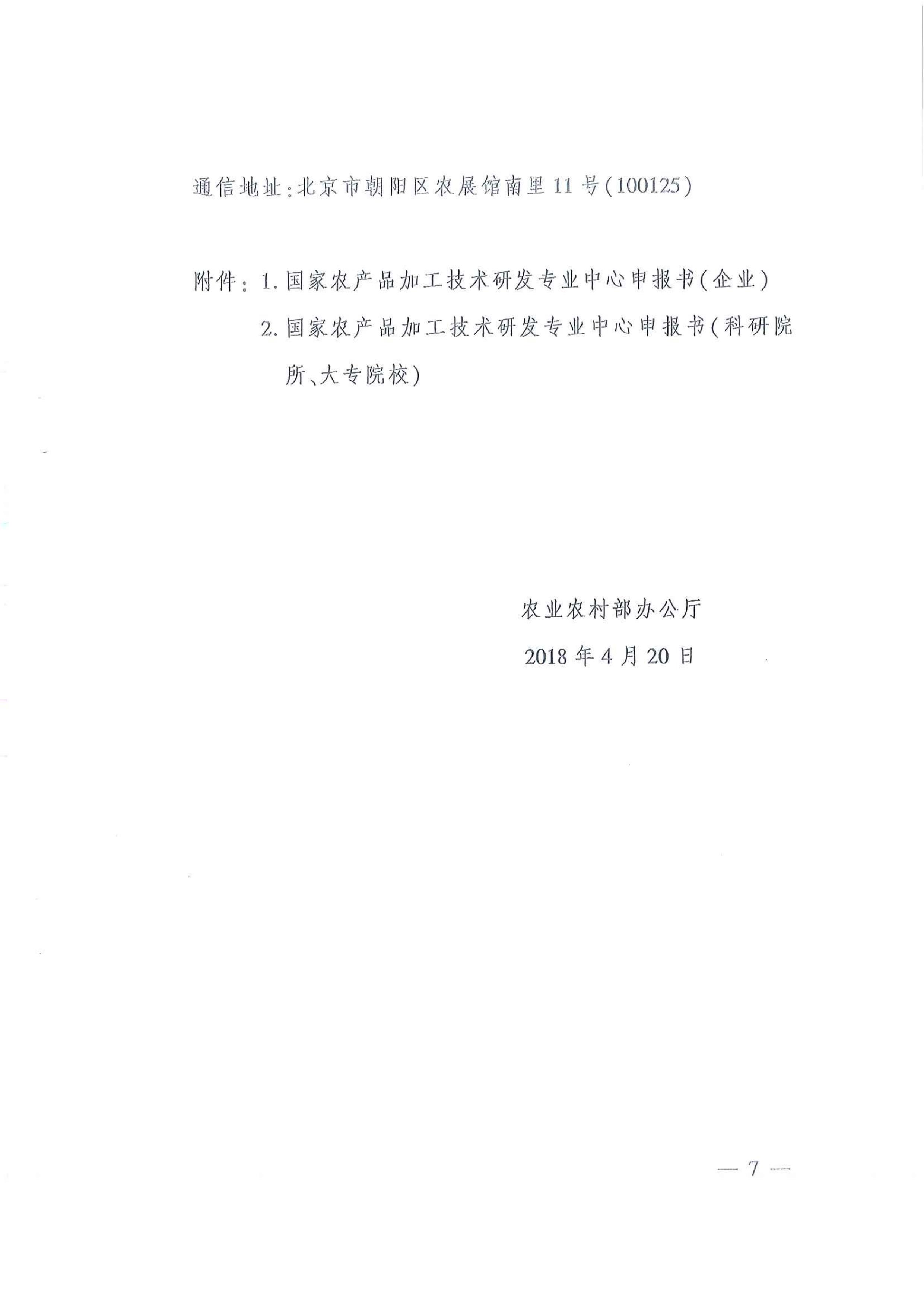 云南省農業(yè)廳辦公室轉發(fā)農業(yè)農村部辦公廳申報2018年度國家農產品加工技術研發(fā)專業(yè)中心工作文件的通知