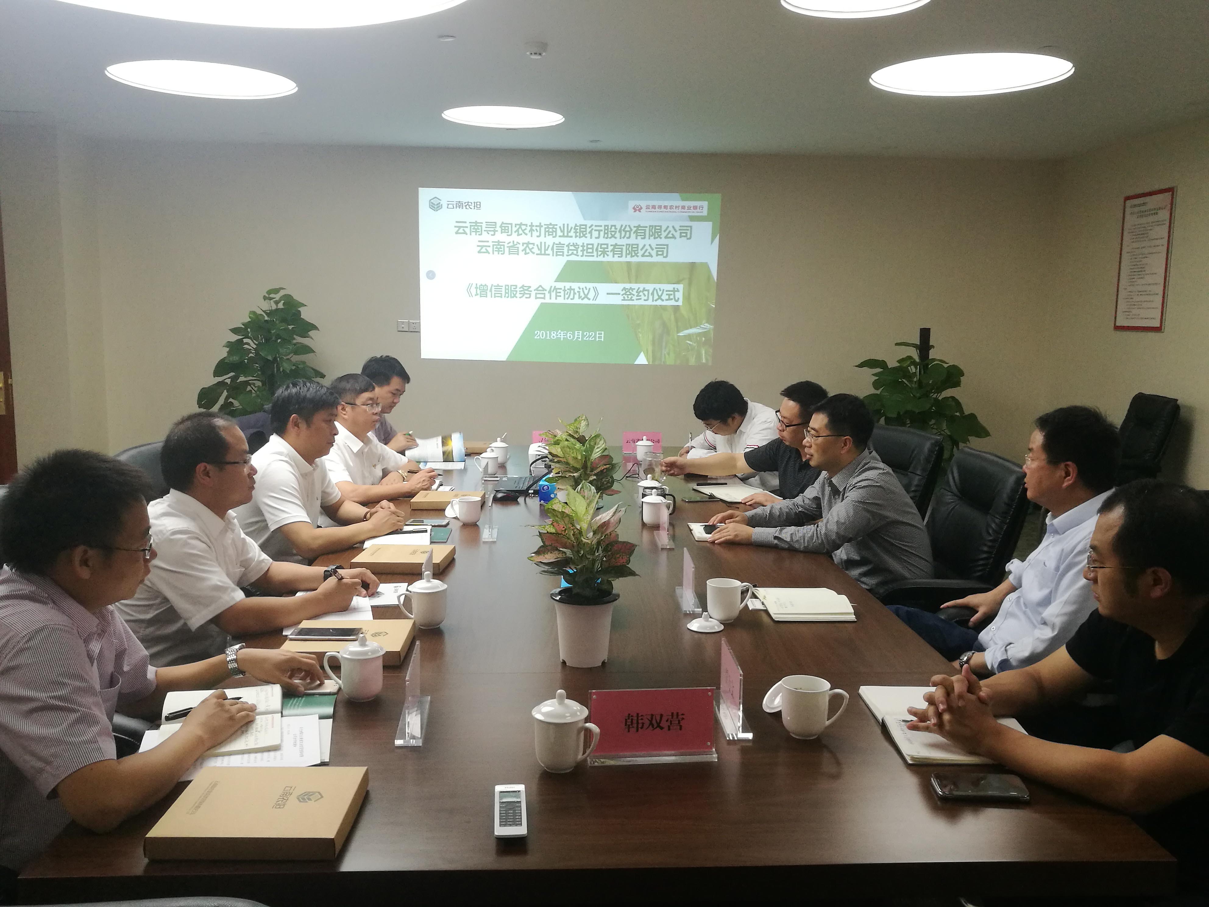 2018年6月22日,云南省農(nóng)業(yè)信貸擔(dān)保有限公司與云南尋甸農(nóng)村商業(yè)銀行股份有限公司在昆明召開銀擔(dān)合作座談會,并簽署《尋甸縣新型農(nóng)業(yè)經(jīng)營主體增信服務(wù)合作協(xié)議》。省農(nóng)業(yè)信貸擔(dān)保有限公司董事長郭影、總經(jīng)理杜開波、副總經(jīng)理廖寅皓,尋甸農(nóng)商行董事長虞燕林、行長李葉忠、副行長范彪等領(lǐng)導(dǎo)參加座談。