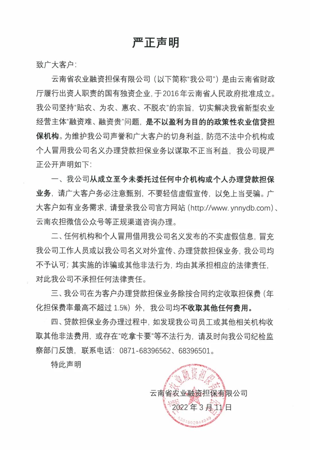 云南省農業(yè)融資擔保有限公司嚴正聲明
