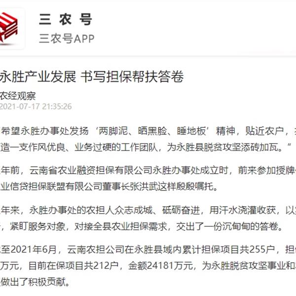 2021年7月17日,《農(nóng)民日?qǐng)?bào)》三農(nóng)號(hào)以“助力永勝產(chǎn)業(yè)發(fā)展 書寫擔(dān)保幫扶答卷”為題對(duì)云南農(nóng)擔(dān)永勝辦事處進(jìn)行了專題報(bào)道。